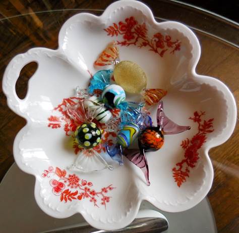 Caroline and I took a walk in the Champ de Mars yesterday morning, with a detour off to the side to see the garden, musical instruments column, and gift shop of the Musée du Quai Branly. She comes to Paris every year for at least one stay (sometimes two or three?) in her cousin’s apartment on the avenue Emile Zola. We met on Sanibel Island, as members of the local Zonta Club. Then she moved to Australia years ago. So Paris is now the place where I see this friend! The Champ was a pleasant place to walk and talk yesterday. Caroline has been to the Branly museum before, but she had not seen the glass column with 10,000 musical instruments inside. She spotted a few instruments that reminded her of things she’d seen when she lived in Bali; excitedly, she described those strange instruments to me. We browsed through the museum’s shop, and I was the one who ended up buying something: a set of 10 audio CDs (comprising 17 albums) of jazz piano music for just 20 euros. I knew Tom would love to have this set which includes original albums by Thelonius Monk, Phineas Newborn Jr., Oscar Peterson, Erroll Garner, Bill Evans, Lennie Tristano, Ramsey Lewis, Duke Ellington, Sonny Clark, Bud Powell, Mary Lou Williams, Dave Brubeck, and more. Another fun shopping experience that Tom and I had recently occurred right on the ground level of our building. As you face the front door of our building, there are two average-size boutiques to the left, and one tiny boutique to the right. The tiny boutique is now a consignment shop (depot vente) selling decorative objects and ladies’ accessories (designer handbags and costume jewelry). Last year, the shop sold cheap but colorful ladies’ clothing made in China. This year the shop is more interesting to us. We stopped in a couple weeks ago and met the interesting lady who runs this boutique. She is a few years younger than I am, with stylish medium-length gray hair, dark-framed glasses, and a deep Lauren-Bacall type of voice. She was charming and funny. We told her we’d be back before she left on vacation (which was yesterday). So, a couple days ago, we did step into the boutique again and we bought a Limoges dish decorated in a sort-of Japanese way, as well as some Murano glass faux candies. We collect both of these types of things. Now, with the dish and “candies” on the coffee table in the living room of the apartment, we feel even more at home. It is surprising, the feeling of comfort that we each have when we look at that dish. Just like home . . . .