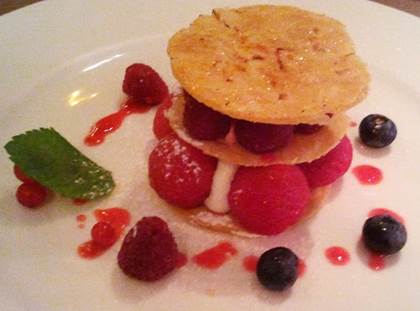 But the apartment is home, too. We’ll be here this afternoon, watching the final stage of the Tour de France as it comes into Paris and the winners are recognized on the podium at the Champs Élysées. I look forward to all the spectacular helicopter views of this magnificent city. Speaking of spectacular views, I try to not take for granted the Eiffel Tower, which we see so often because it is on our most commonly taken neighborhood walk. We walked by it yesterday, as we ambled about in the hour before dinner. Dinner was at a familiar location, but a new restaurant (for us). We used to dine there when it was Le Bayadere, a fairly casual bistro with good food, and good value. Then in the past year or two it changed to Le Court Bouillon. I looked at the posted menu last year, saw the greatly increased prices, and put it out of my mind for a while. But I’ve been noticing this year how extremely good the lafourchette.com reviews for this resto have been. I booked a table for our “Saturday night date” last night. We were seated right where we sat numerous times, when the place was Le Bayadere. The similarity pretty much ended there. Le Court Bouillon is an elegant French restaurant. The chef, Eric Achard, formerly worked at the famous Taillevent and the Plaza Athenée. His wife, Isa, runs the dining room and formerly worked for the Lutétia and the Cours Florent. They knew each other where they grew up, in the Sarthe and Loir-et-Cher. They lost touch when they were young adults, but somehow found each other again later. I think they began their careers in the 15th arrondissement, but then lived and worked in Levallois, a suburb of Paris. And they’ve worked in those famous places in Paris that I mentioned. But now we have them back in the 15th arrondissement, much to our dining pleasure. We began our feast by sharing an order of terrine foie gras – the best foie gras I’ve had for a very, very long time. Tom’s main course was a lamb filet that was just superb. It came atop some darphin potatoes, which are like latkes. Yummy! I ordered the dorade royale, and it was splendid in every way. The filet was cooked perfectly, and came atop a smooth, buttery layer of finely puréed potatoes, with a little bit of puréed kalamata olives as a garnish. For dessert, Tom ordered the millefeuille of strawberries and raspberries. It was light and nice, but not as spectacular as the rest of the dinner. I must say that the service was very fine. The young man who served us part of the dinner was very professional, and Isa was bright, cheerful, and ever-smiling – just a brilliant lady. The stroll home after dinner is so easy – simply straight down the rue du Theatre. Le Court Bouillon is near the river end of this street, and we’re near the theater end. At home, we read on our devices – Tom read the news, and I read a book, The Time in Between – and listened to a CD from the new collection: jazz piano by Bill Evans, and Duke Ellington.
