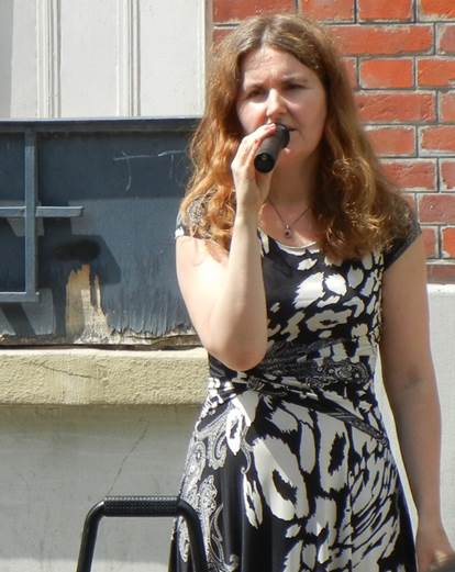 middle-aged woman set her Karaoke machine up on the sidewalk across from the