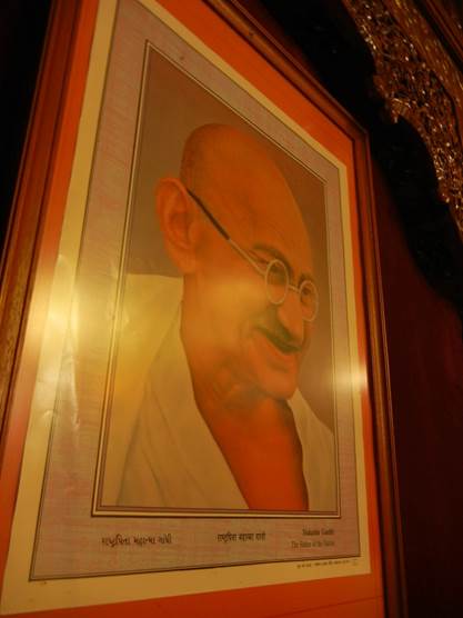 large, framed pictures of Mahatma Ghandi on the walls. We sat right in front of one of them. Then there are Raj elephants featured in